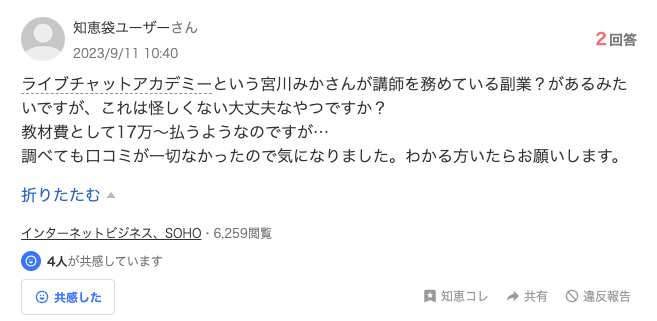 ライブチャットアカデミーは、宮川みか氏が主宰する副業系オンライン講座です。