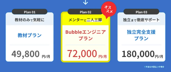 | 料金プラン | 教材プラン/Bubbleエンジニアプラン/独立完全支援プラン |