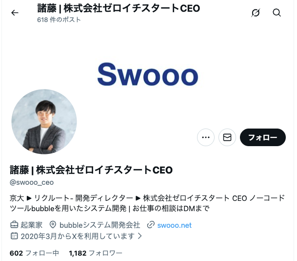 | 所属・役割 | Swoooの会社紹介では「ゼロイチスタートの代表」として紹介あり |